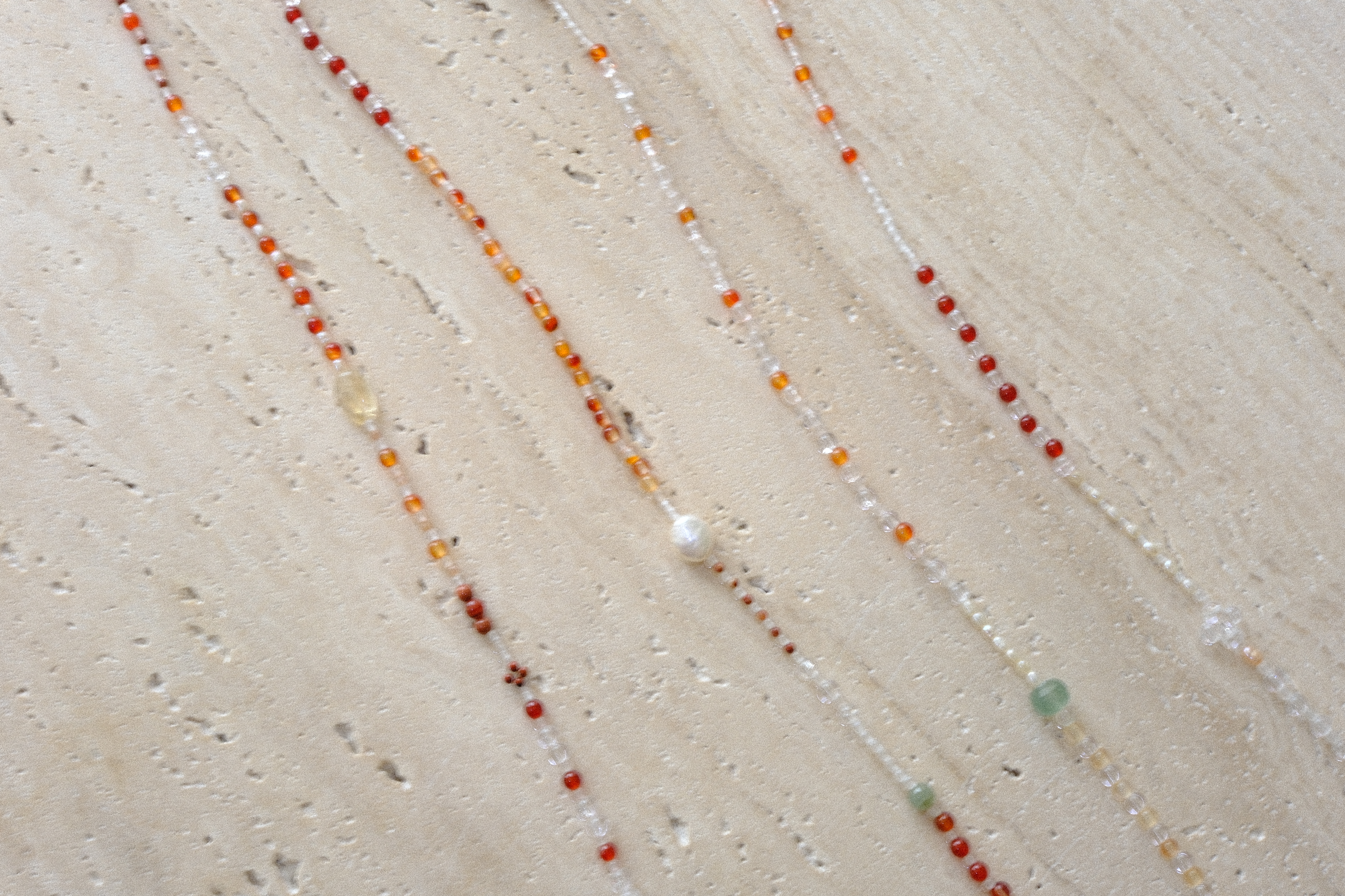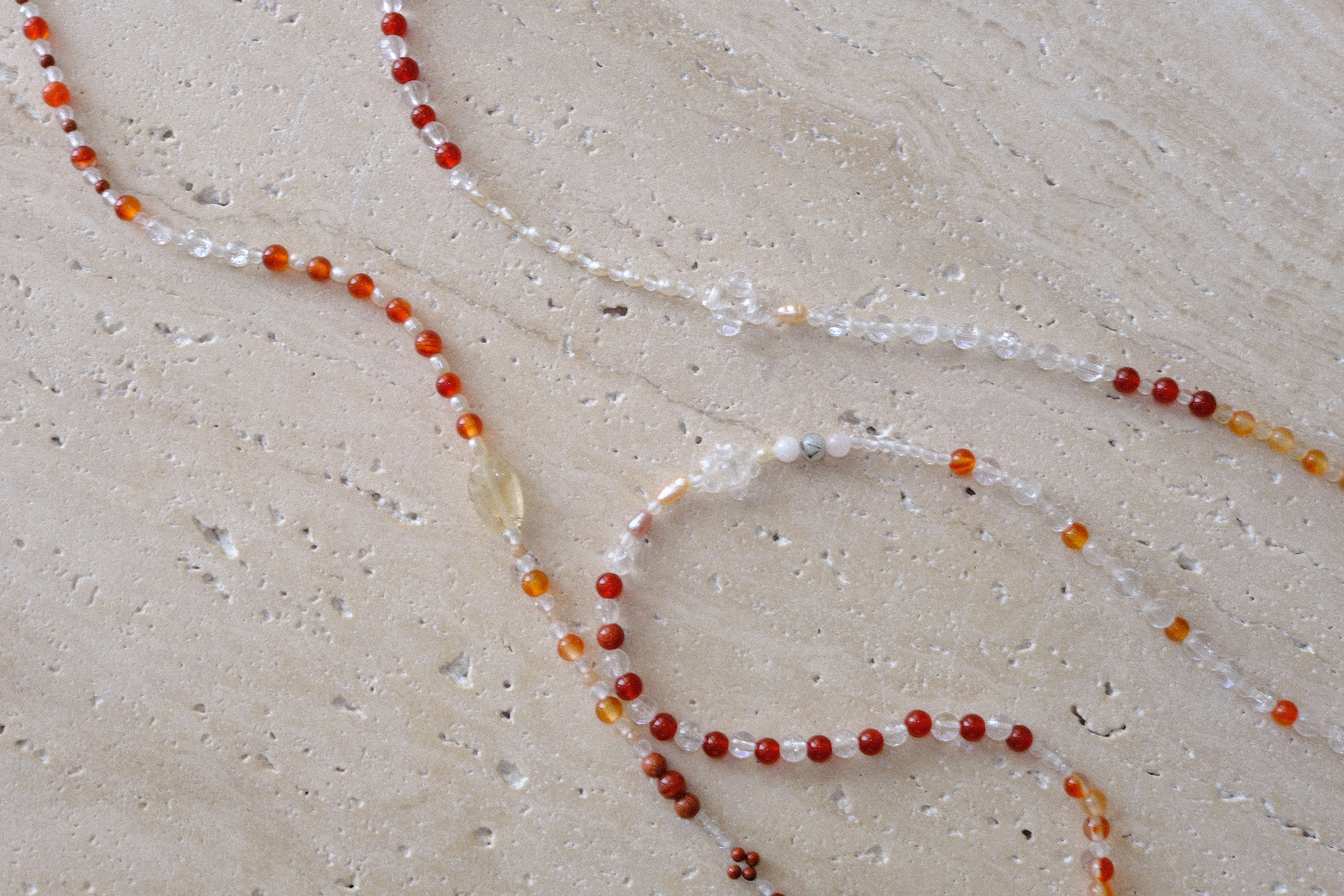 - carnelian, snow crystal, dyed agate, rose quartz, tourmalinated quartz, amazonite, mookaite jasper, Indian agate, carnelian, green quartz, jade, prehnite jade, strawberry quartz, citrine quartz, rock crystal quartz, moonstone, red rainbow jasper, white freshwater pearl, pink rice pearl, purple rice pearl, white rice pearl.